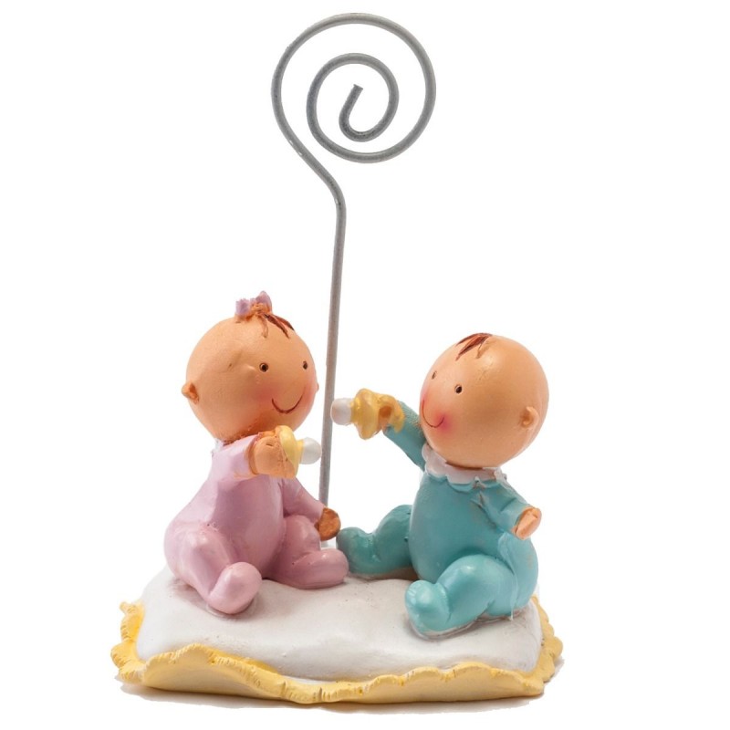 Porta fotos em resina com figura de gémeos, um menino e uma menina