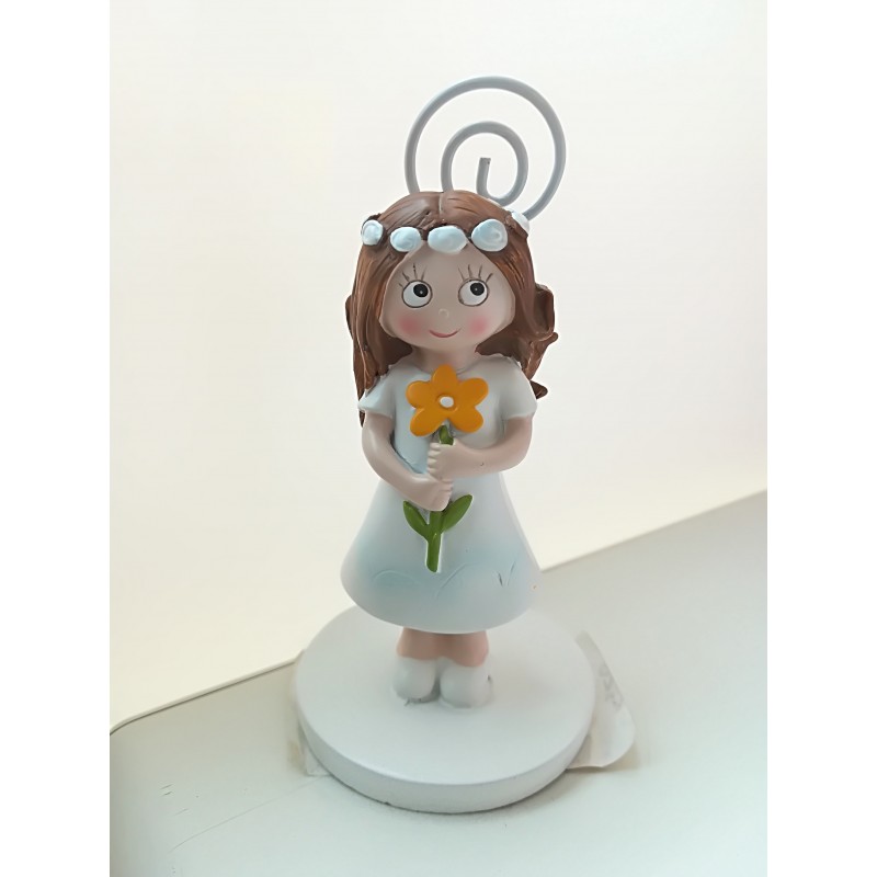 Porta fotos com figura de menina vestida de branco e com flor amarela na mão. Cerca de 10,5cm de altura