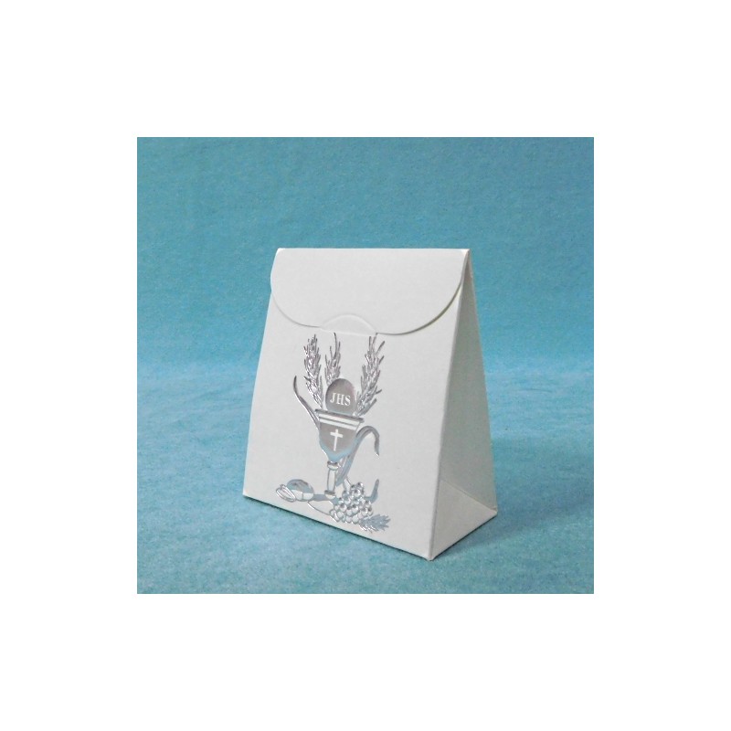 Caixa de cartão branco para lembrança com simbolos de Comunhão em relevo prateado