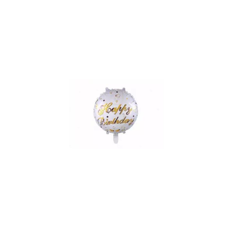 Balão metalizado brancom com letras "Happy Birthday" em dourado