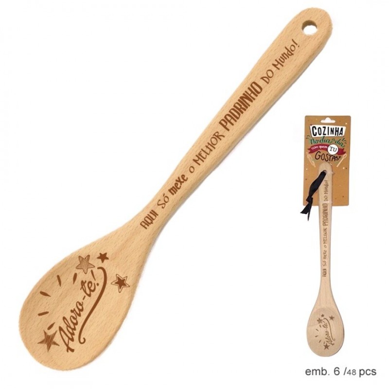 Colher de pau (em madeira) com a mensagem "Aqui só mexe o melhor Padrinho do mundo!" conforme imagem