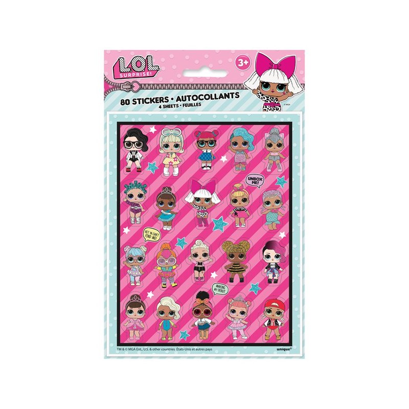 Embalagem de 4 folhas de autocolantes do tema LOL Surprise.