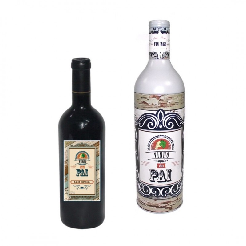Lata com garrafa de vinho tinto no interior, de 750ml e no rótulo "Vinho do Pai - Casta Especial"